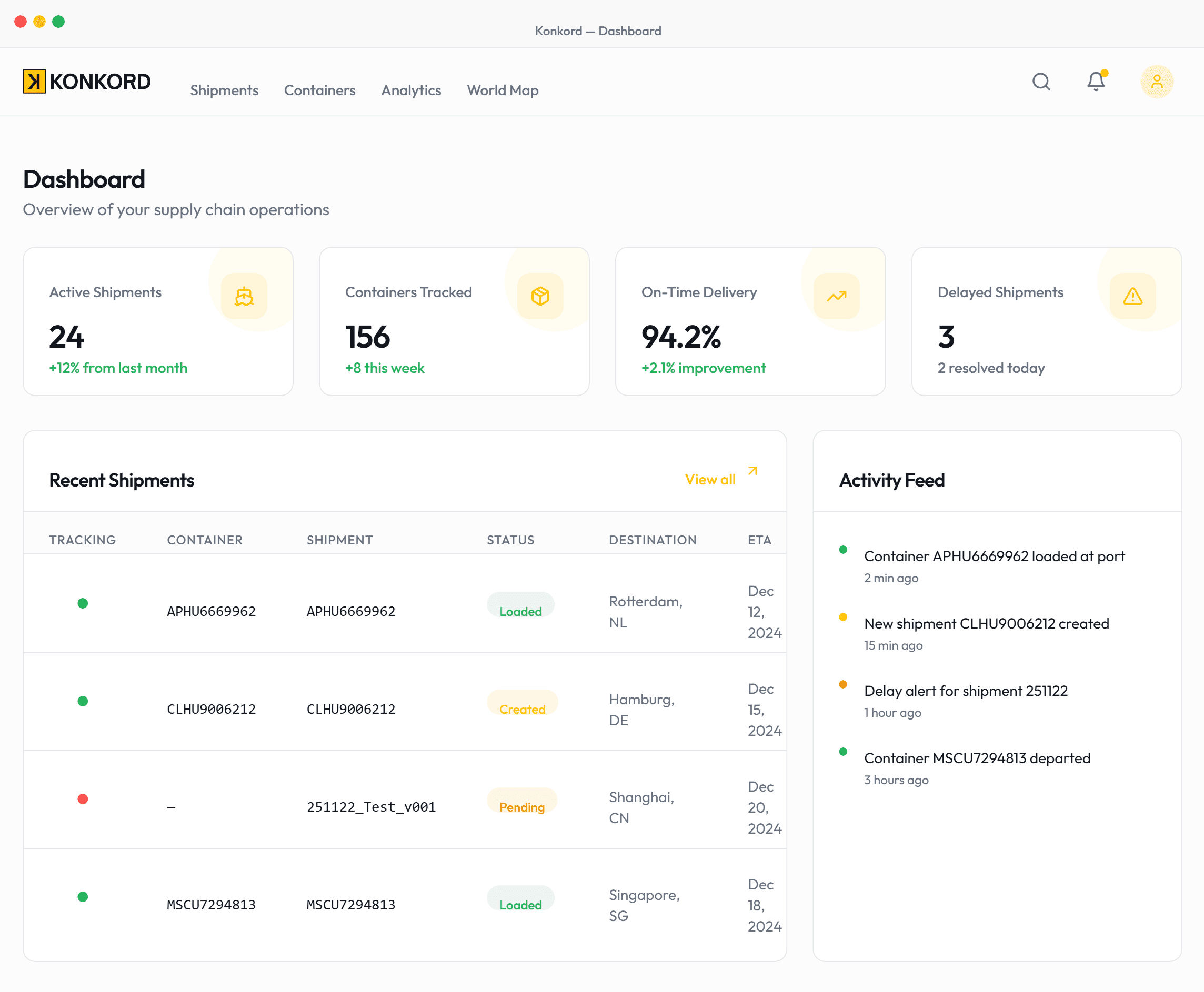Konkord combines powerful tracking features with a simple interface – giving you complete visibility across all your shipments, containers, and orders.